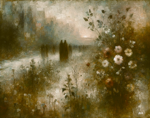 In hues of twilight, the search begins,On canvas vast, where silence spins.A party small, with lanterns light,Seeking through the shroud of night.Their shadows dance in muted tones,Across the oil, their purpose moans.A quest for what's lost, or never was,In strokes of paint, their hope does buzz.The faded colors whisper tales,Of longing deep, where memory sails.A vintage scene, of eerie cast,Where dreams are sought, and time is past.So let them search, these souls of art,For in their quest, they find their heart.And though they roam, in despair's embrace,Within the canvas, lies their grace.