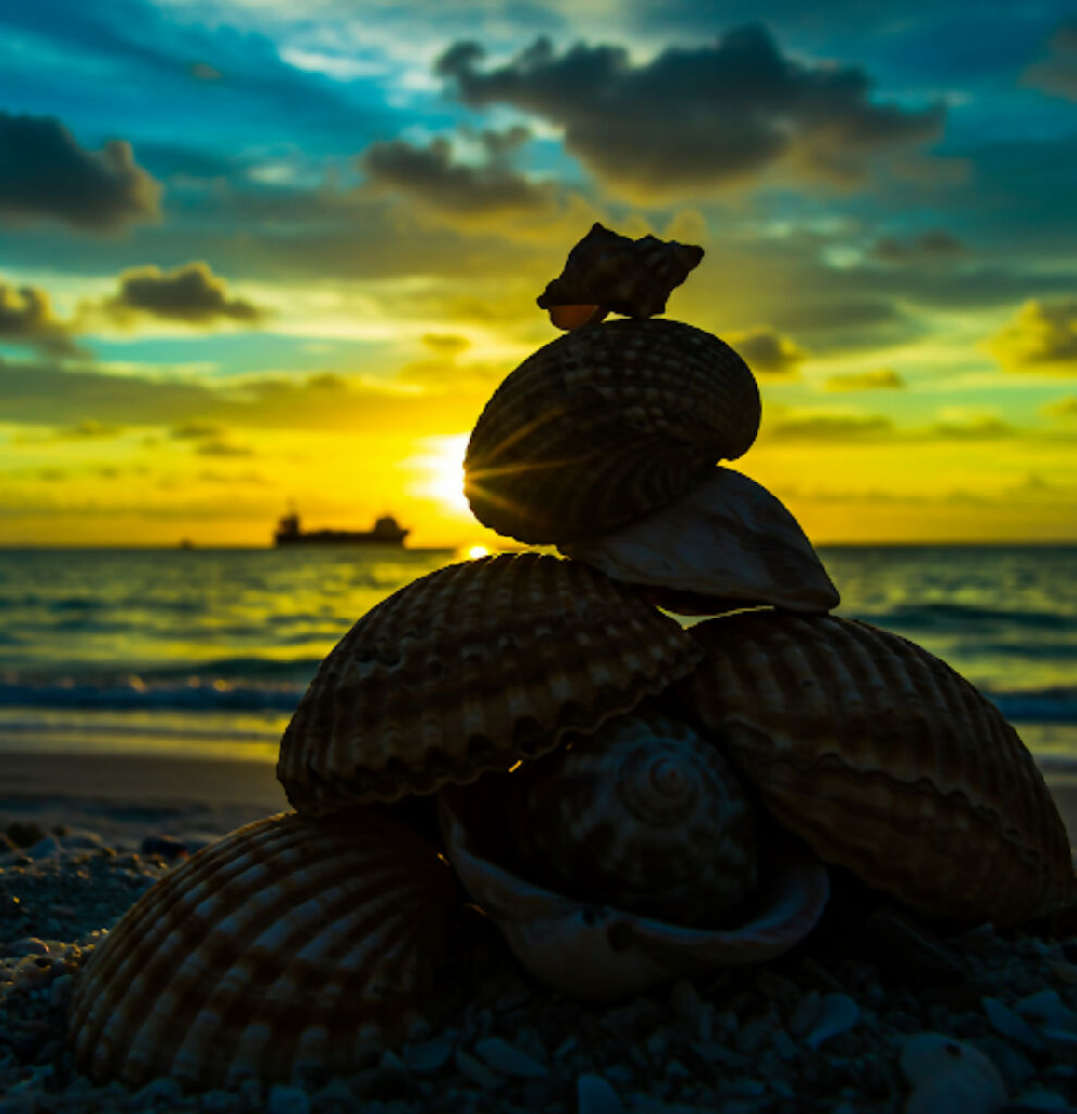 A stacked pile of seashells at the shore of a beach during a vivid and beautiful sunrise.