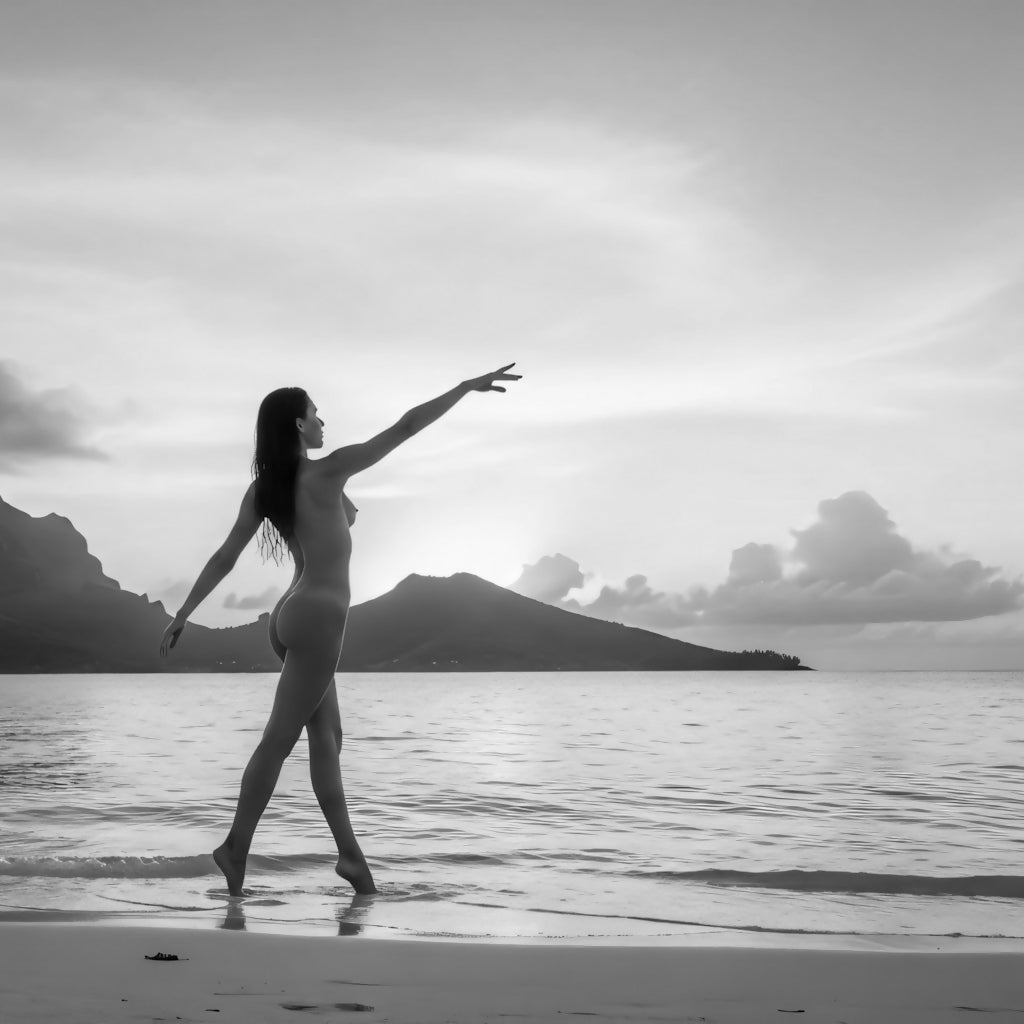 Beautiful black and white photo of a woman in a graceful ballet pose on a tropical beach, with a dramatic mountain visible in the distance.