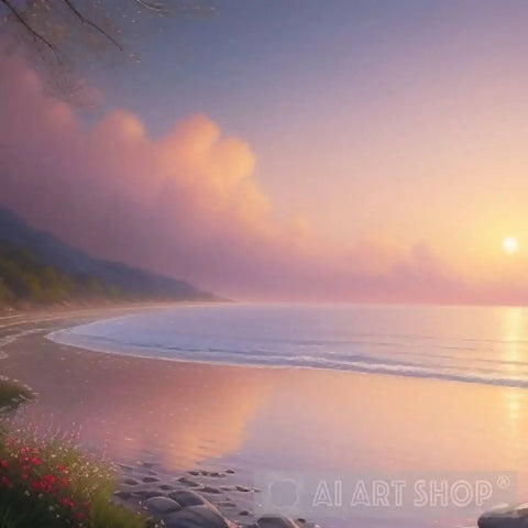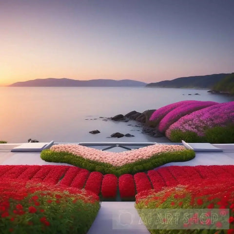 In this beautiful painting, the beauty of nature and the magnificence of the sea harmonize with the splendid sunset and its enchanting colors. On the seashore, we see a bed of charming roses, where red roses meet yellow roses, and merge with purple roses, creating a wonderful scene of harmony and beauty.