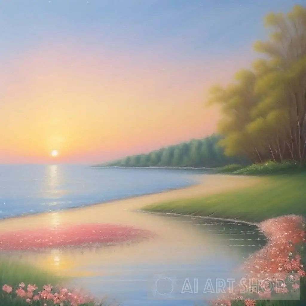 Next to the yellow bed, a forest of pine trees spreads, adding beauty and charm to the scene. Towering mountains stretch along the sea, colored with different hues as the sun's rays penetrate through the sunset.