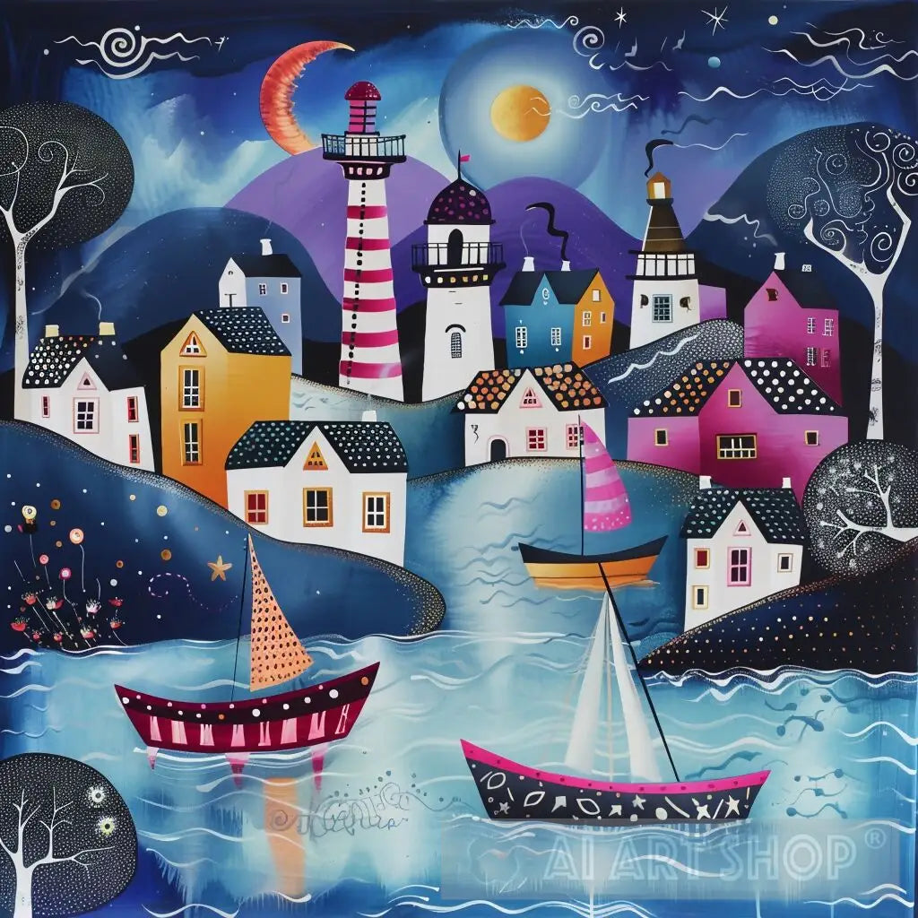 Experience the cheerful atmosphere of a cozy seaside village with lighthouses and boats, illustrated in deep blues, purples, and blacks. This piece captures the magical and serene essence of folk art