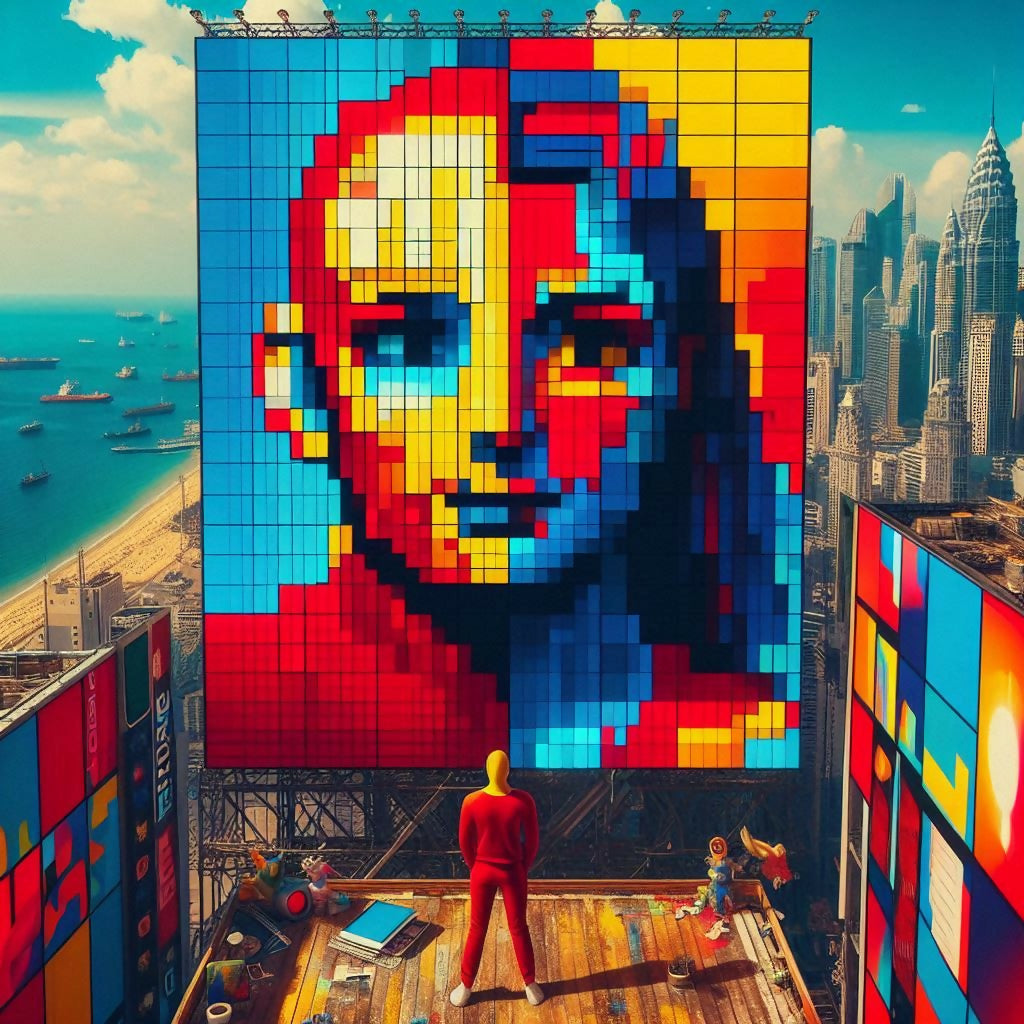 "This piece explores the fragmented nature of identity in the digital age, where technology and self intersect. Through vibrant pixel art and a striking urban backdrop, I invite viewers to reflect on the complexities of modern identity and the role of technology in shaping our lives."
