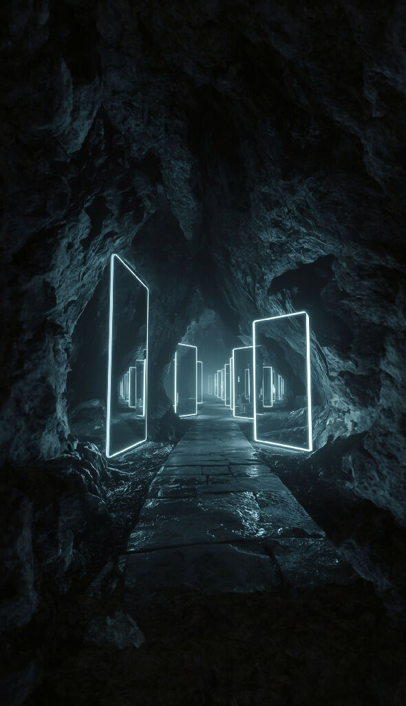 Semi-realistic style, side view (profile angle), wide shot. Inside a mysterious, rocky cave. Large white mirrors stand along the front and side edges of the stone pathway, forming a corridor of reflections. The mirrors glow faintly and reflect the path and walls with slight distortion. A narrow stone path runs through the cave from left to right, with rocky terrain and misty atmosphere surrounding it. The cave is dimly lit, with soft reflections and magical ambiance. The view is from the side, showing depth and scale of the corridor formed by the mirrors.