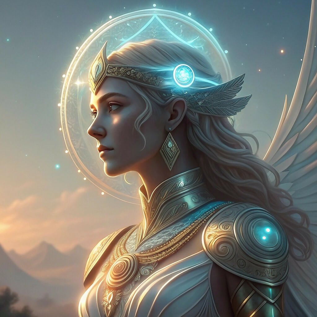 A digital illustration showcases a woman, seemingly an angelic or divine figure.