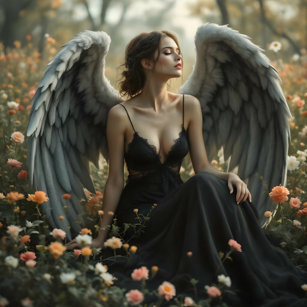 In the hush of a blooming glade, a dark-winged angel rests—draped in a flowing black gown, eyes closed in tranquil surrender. Surrounded by spring blossoms, she radiates stillness, strength, and sorrow. Her posture speaks of patience; her silence, of protection.