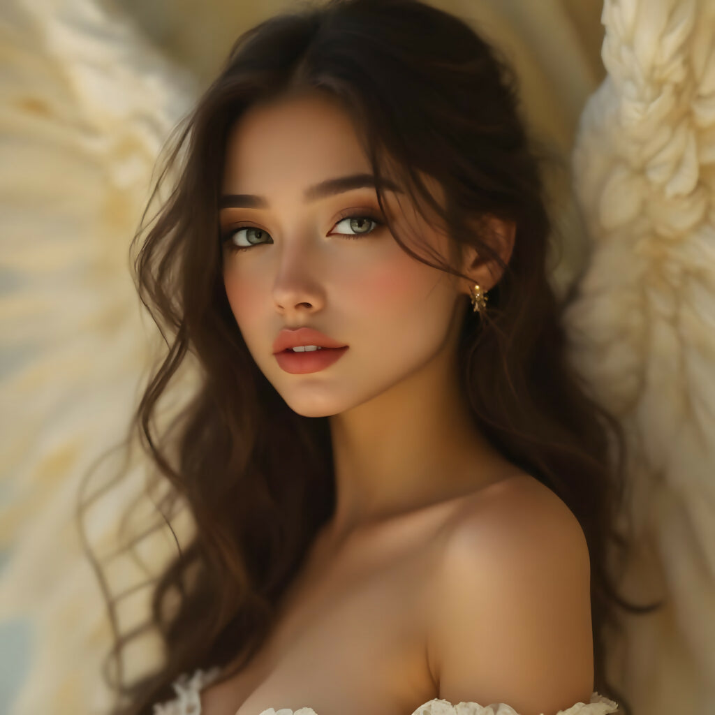 Graceful and serene, this stunning angel radiates quiet strength and ethereal charm. With cascading dark hair, soft amber eyes, and delicate wings of ivory silk, she evokes an otherworldly presence—both gentle and powerful. A portrait of divine calm, this image is ideal for those who admire angelic grace, fantasy elegance, and celestial feminine beauty.