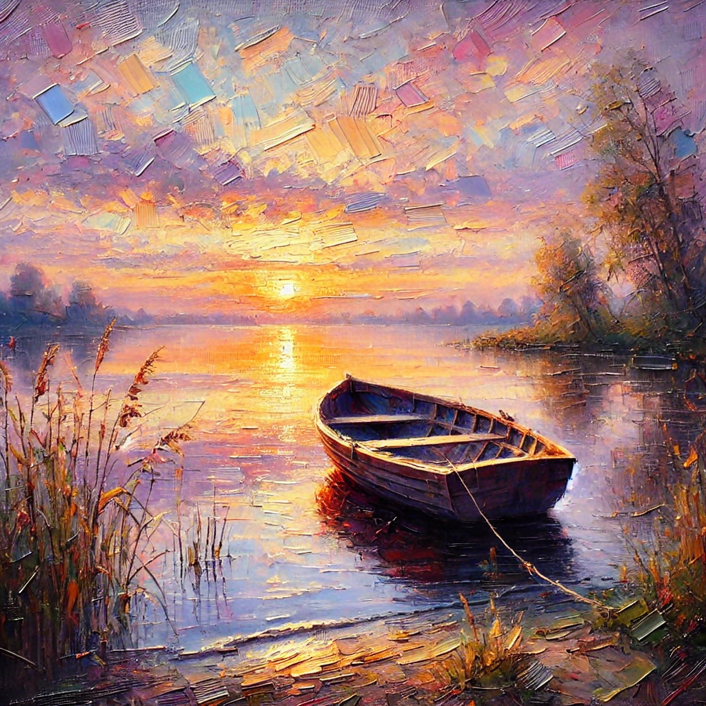 This painting captures the serene beauty of nature, evoking the timeless theme of "harmony between humanity and nature." The lone boat symbolizes solitude and inner peace, while the breathtaking sunset invites viewers to a moment of introspection and mindfulness.