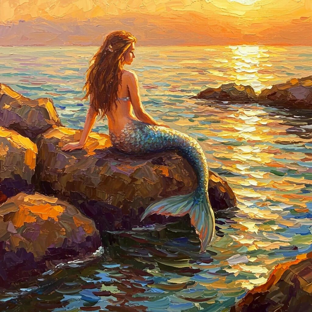 The primary light source comes from the low-angle sunset, casting a layered interplay of light and shadow on the sea and rocks. The artist skillfully uses thick brushstrokes to depict the shimmering reflections on the water’s surface, creating a sense of movement. The mermaid's body is softly shaded to enhance its three-dimensionality while ensuring it blends naturally with the surrounding environment.