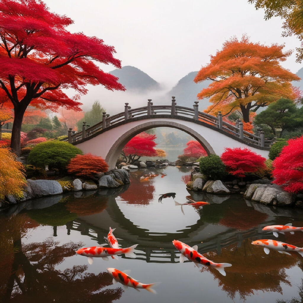 Serene autumn scene featuring a traditional arched bridge spanning a calm body of water, 3 of 4
