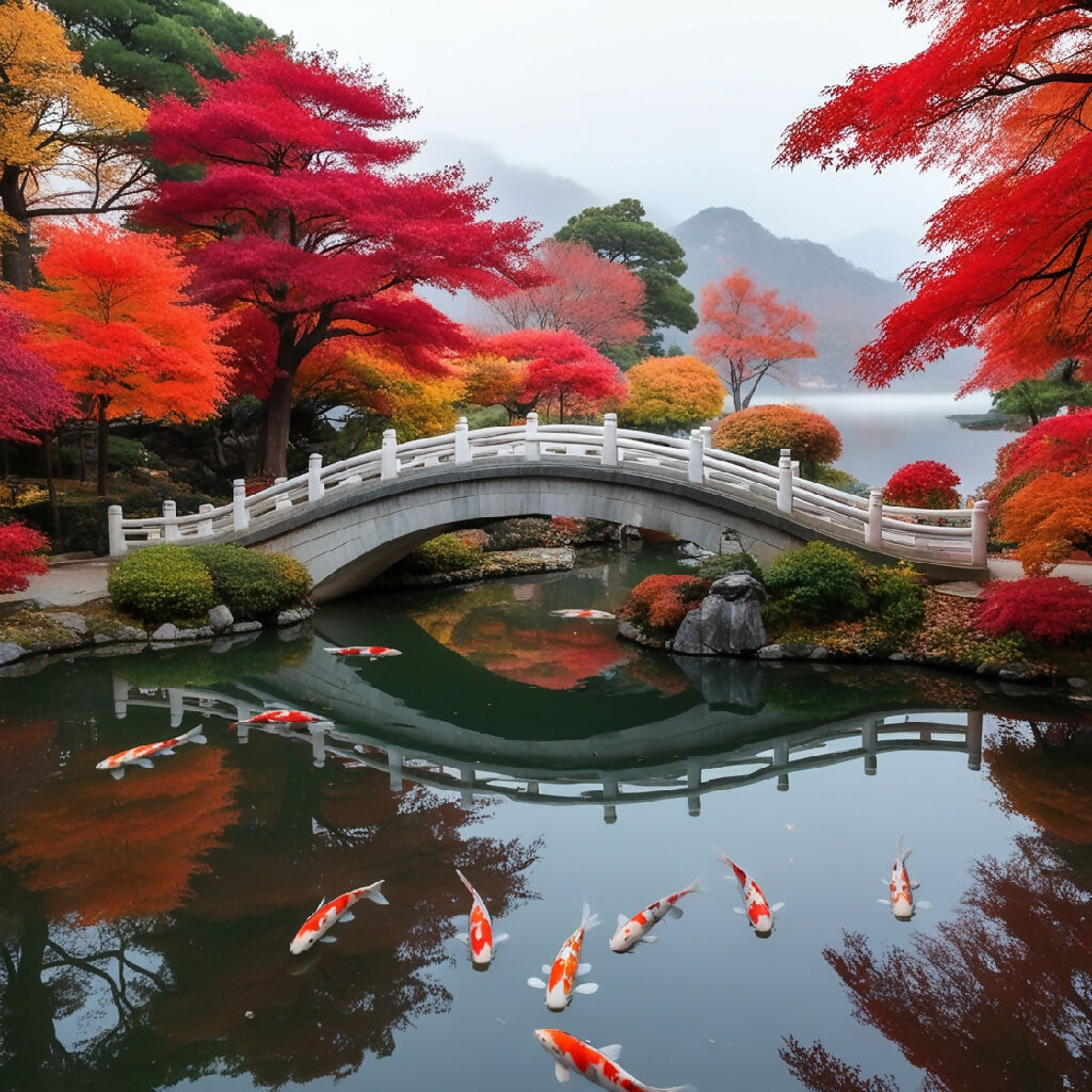 Serene autumn scene featuring a traditional arched bridge spanning a calm body of water, 4 of 4