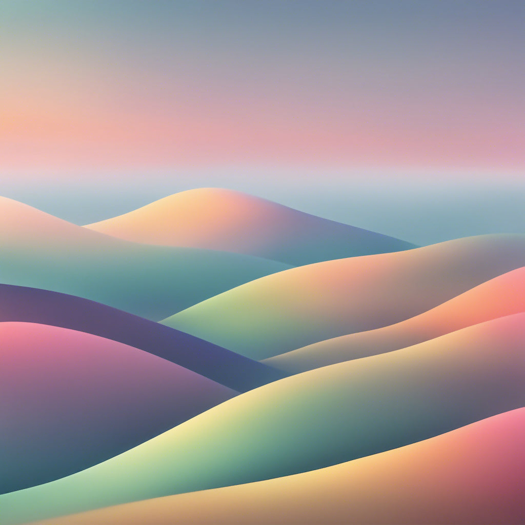 Minimalist serene landscape rolling hills bathed in soft rainbow gradient, smooth misty air calm and meditative art style.