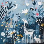 Discover the whimsical essence of a serene meadow with wildflowers and playful animals, rendered in cool grays, blues, and whites. This artwork blends vibrant and minimalistic elements with a touch of cubism.