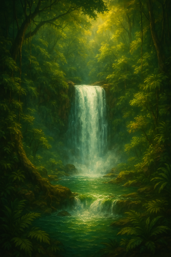 A tranquil digital painting of a waterfall cascading through a lush rainforest with sunlight filtering through the leaves.