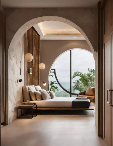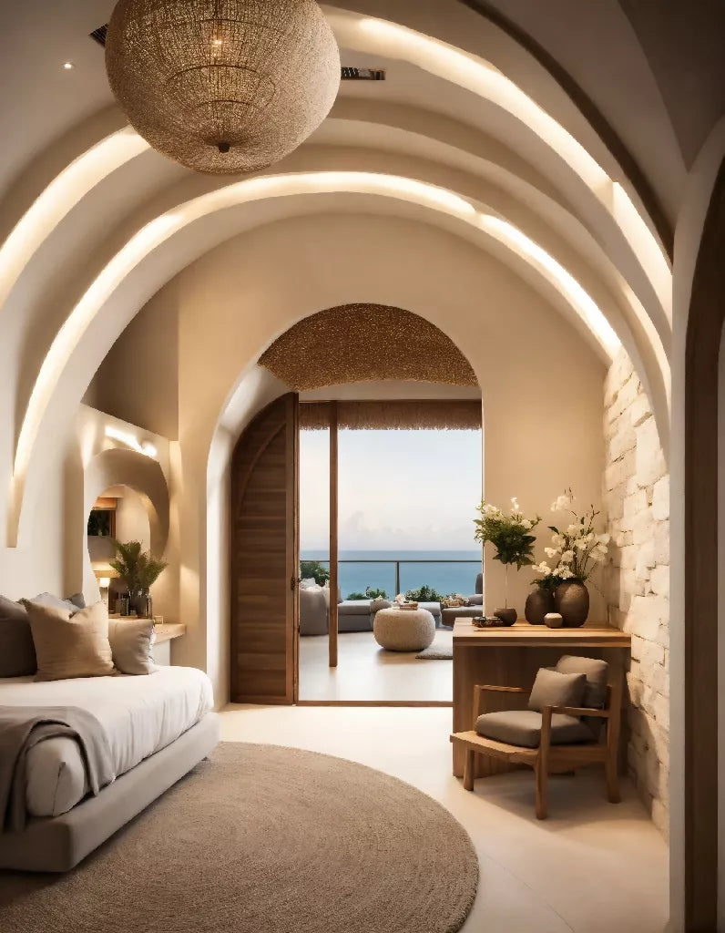 A stunning, ultra-realistic photo of a modern take on Rivendell-inspired interior design. The bedroom features soft white and cream stone walls with light wood accents, creating a serene atmosphere. Elegant round arches frame the space, adding a touch of architectural grace reminiscent of Elven design. The room is bathed in natural light, enhancing the organic, tranquil feel. A blend of modern minimalism and natural textures provides a peaceful, ethereal retreat, bringing Rivendell's timeless beauty into a cozy, contemporary setting.