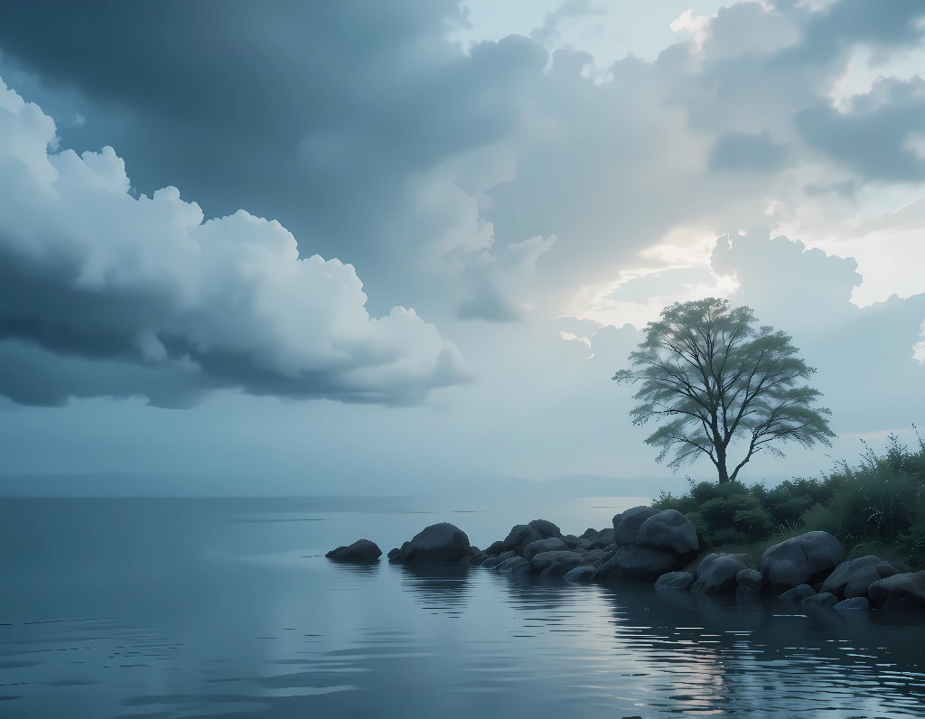 Immerse yourself in the tranquil beauty of Serene Shores. This AI-generated artwork captures a moment of quiet peace, where a solitary tree stands sentinel against a moody sky, reflected in the still waters. The cool tones and ethereal clouds create a calming atmosphere, perfect for contemplation and reflection. Bring a touch of nature's serenity into your space.
