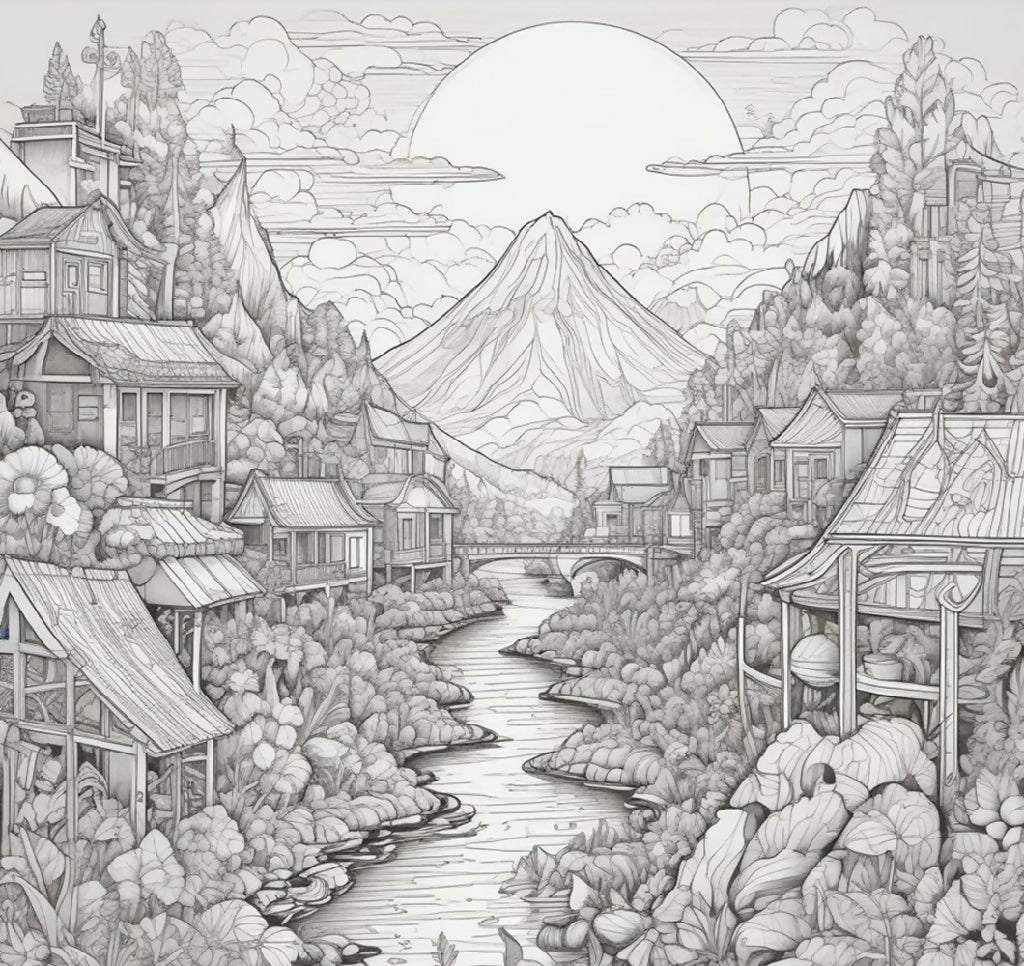 A pencil sketch of serene village with sunrise in the mountain.