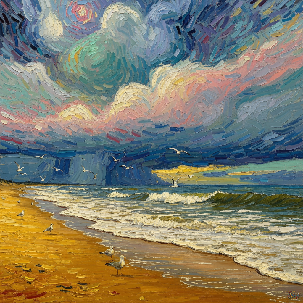 The feeling it evokes is one of raw, natural power—the churning motion of the sea and the fleeting light of the sky are captured with a sense of immediacy and life.