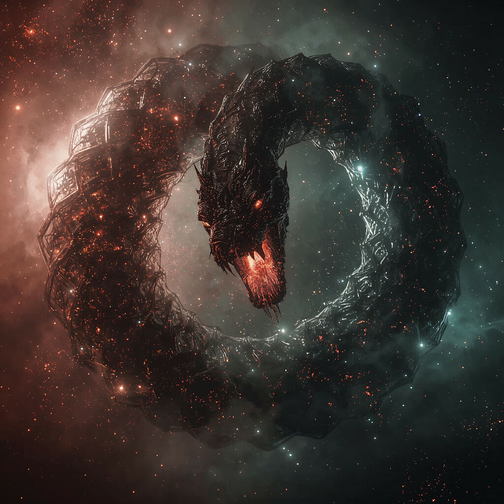 A massive serpentine form coils through star-filled space, its body adorned with intricate patterns that suggest both ancient wisdom and cosmic consciousness. The creature's glowing eyes and luminous throat create focal points of supernatural intelligence, while its scaled surface reflects nebular light. The composition balances the organic curves of the serpent against the geometric precision of celestial bodies, creating tension between instinct and order. Red and golden light emanates from within the creature, suggesting it serves as both destroyer and creator in cosmic cycles. The work evokes mythological traditions of world-serpents while rendering them in contemporary cosmic terms, exploring themes of eternal cycles, hidden wisdom, and the divine nature manifest in primordial forms.