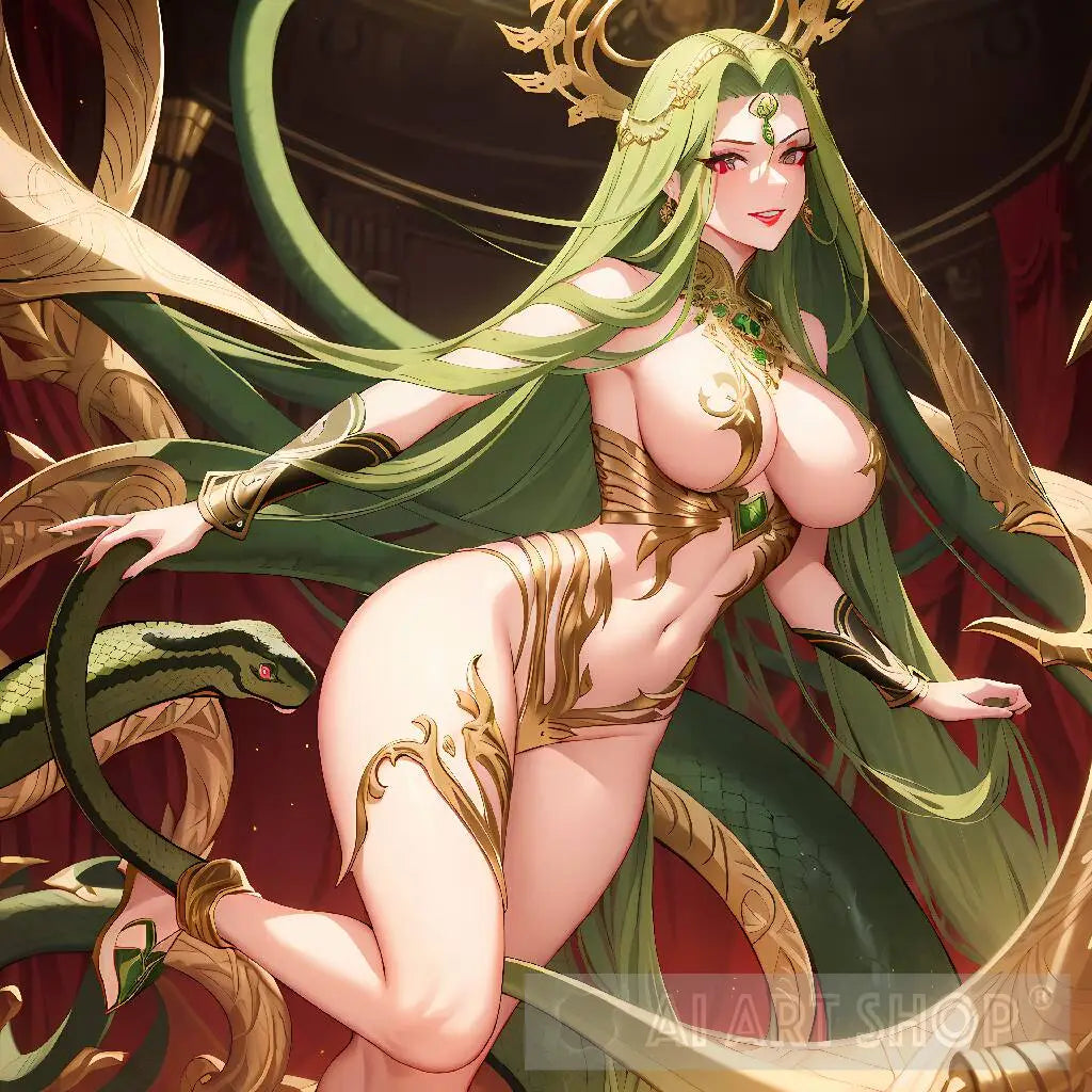 Indulge in the mesmerizing allure of this hot and sexy portrayal featuring a beautiful figure with long, straight, dark green hair and captivating snake eyes. Adorned in excessive gold jewelry, this athletic and fit individual showcases a slim physique, combining the seductive charm of a snake with the grace of a model pose. A portrayal that radiates beauty and a hint of danger, offering a glimpse into the enchanting world of serpent-inspired allure.