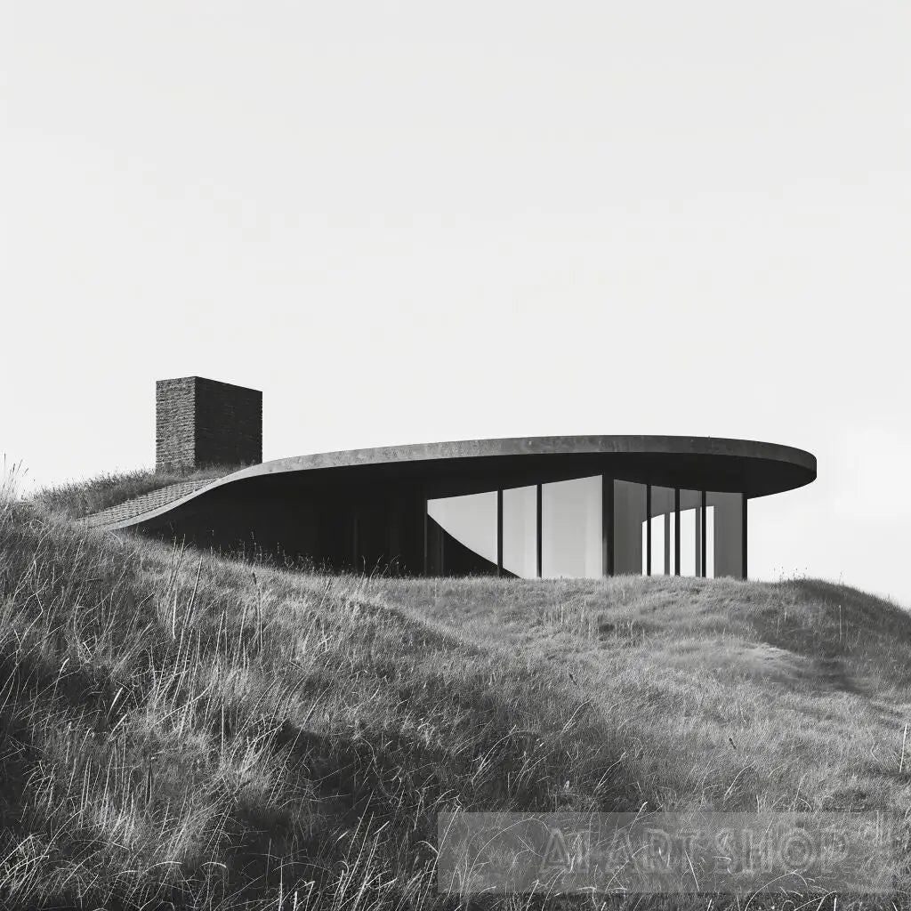 This architectural concept features a house with a flowing, serpentine roofline that undulates with the hillside. The use of glass walls enhances the connection between the interior and the picturesque surroundings.