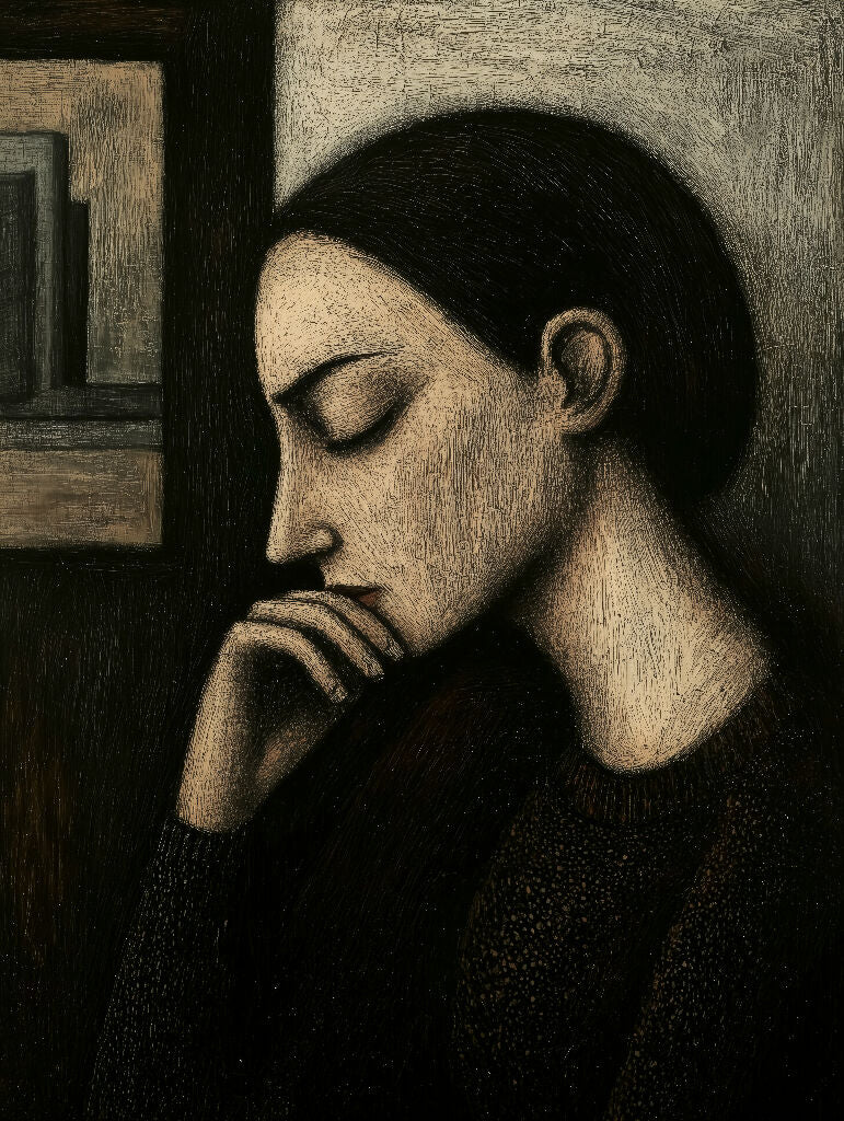 Keywords: monochrome portrait, contemplative art, AI illustration, emotional wall art, black and white painting, modern decor, minimal portrait.