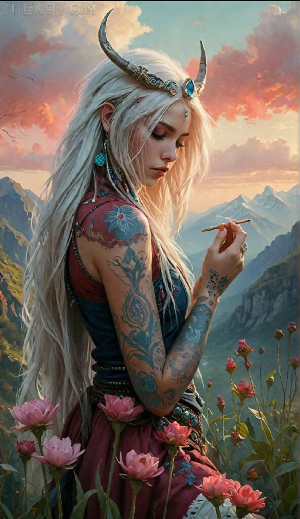 Create a depiction in a magical realm on the style of Seb McKinnon and Jeremy Mann. Beautiful colors of dusty rose, crimson red, Whisper White and tranquil blue set the scene for a mountain Cliffside depiction of a stunning ancient shaman luxury deva, long shiney white hair, arabic tattoos in the styke of Ed Hardy, in a field of outworldly plants, her eyes are closed and shes looking down with an alluring pose. Semi side view. Tracie Grimwood and Alexander Jansson Showcasing different styles and techniques with a unique artistic vision to life, with emotions that blend into a stunning piece of artwork. Highly detailed, precise art photography, RAW.