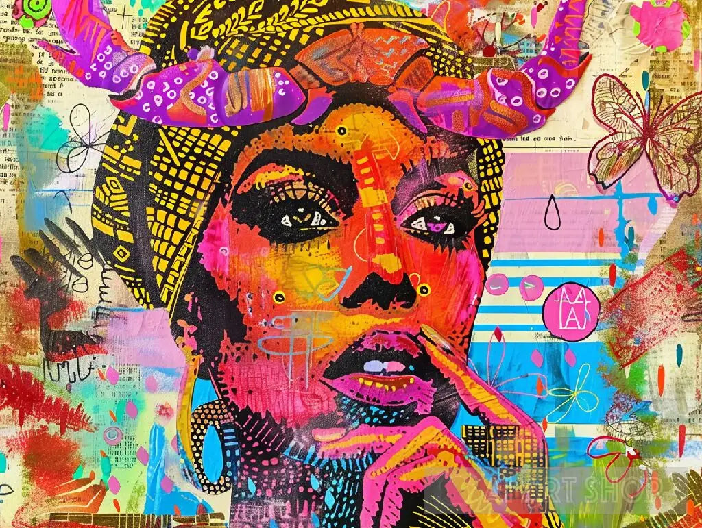 This pop art painting portrays a girl embodying the nurturing and sensitive qualities of the zodiac sign Cancer. The girl is depicted with a gentle and serene expression. The artwork features soft colors and whimsical patterns, creating a warm and comforting atmosphere.