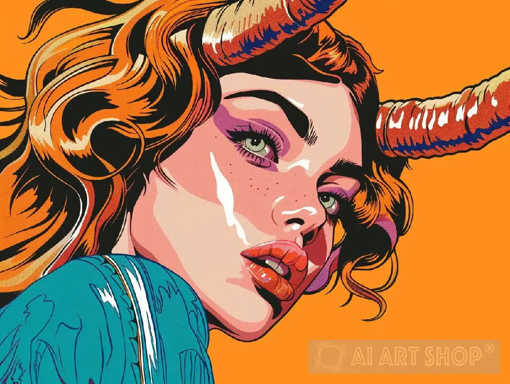 In this captivating pop art painting, a girl embodies the ambitious and disciplined qualities of the zodiac sign Capricorn. She is depicted with a determined and focused expression. The artwork features a color palette of earthy tones , reflecting Capricorn's nature. The girl is shown having a goat’s horns, symbolizing Capricorn's perseverance and determination to climb to the top. This pop art painting captures the essence of Capricorn in a modern and sophisticated style, celebrating the sign's hardworking and responsible personality.
