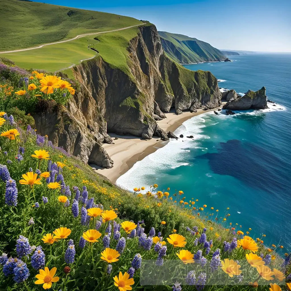 Describe a coastal cliffside adorned with wildflowers, overlooking the vast expanse of the shimmering ocean.