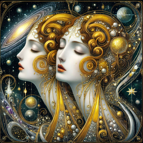 The picture radiates a fascinating, dreamlike splendor reminiscent of the masterpieces of Art Nouveau, inspired by the unmistakable elegance of Gustav Klimt. Two graceful female faces in half-profile dominate the composition, their skin as if made of porcelain, their features flawless and timelessly beautiful. Their closed eyes suggest an inner universe, as if they were lost in a deep, cosmic dream.