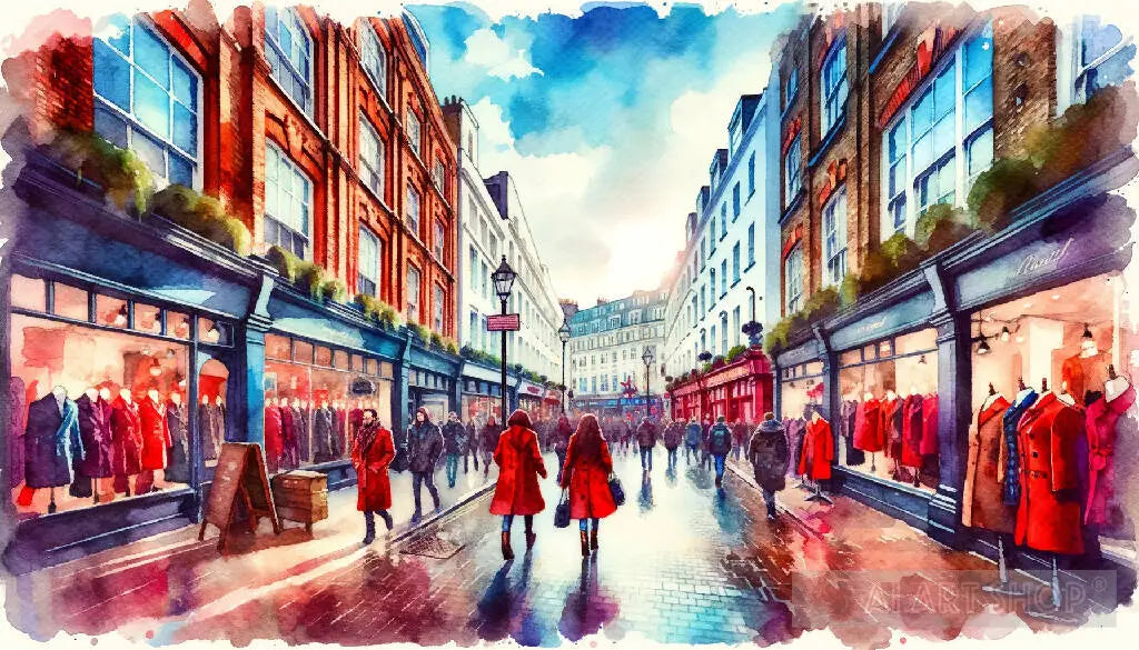 This watercolor painting captures a bustling shopping street scene, seemingly set in the late afternoon given the warm tones near the horizon. The street is busy with numerous people, many of whom are wearing red coats, which stand out against the cooler colors of the scene. The pedestrians carry shopping bags, suggesting a lively retail atmosphere.