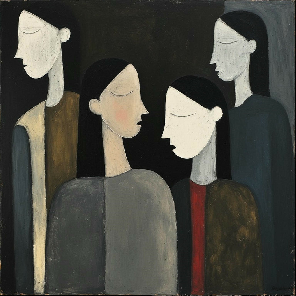 This artwork features four stylized figures of women, rendered with elongated forms and a minimalist aesthetic.