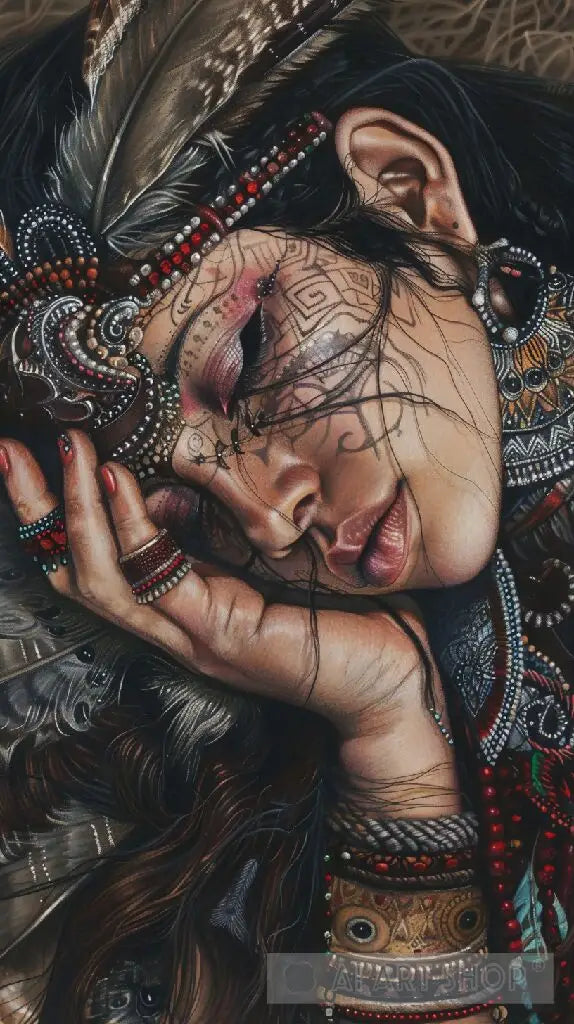 Silent Dreams" depicts a serene scene of a Native American woman peacefully asleep. Her features are tranquil, framed by the soft glow of moonlight filtering through the canvas of the night. Wrapped in a blanket adorned with intricate patterns, she embodies the quiet strength and beauty of her heritage. This captivating painting invites viewers to immerse themselves in the peaceful reverie of the sleeping maiden, where dreams dance beneath the starlit sky.
