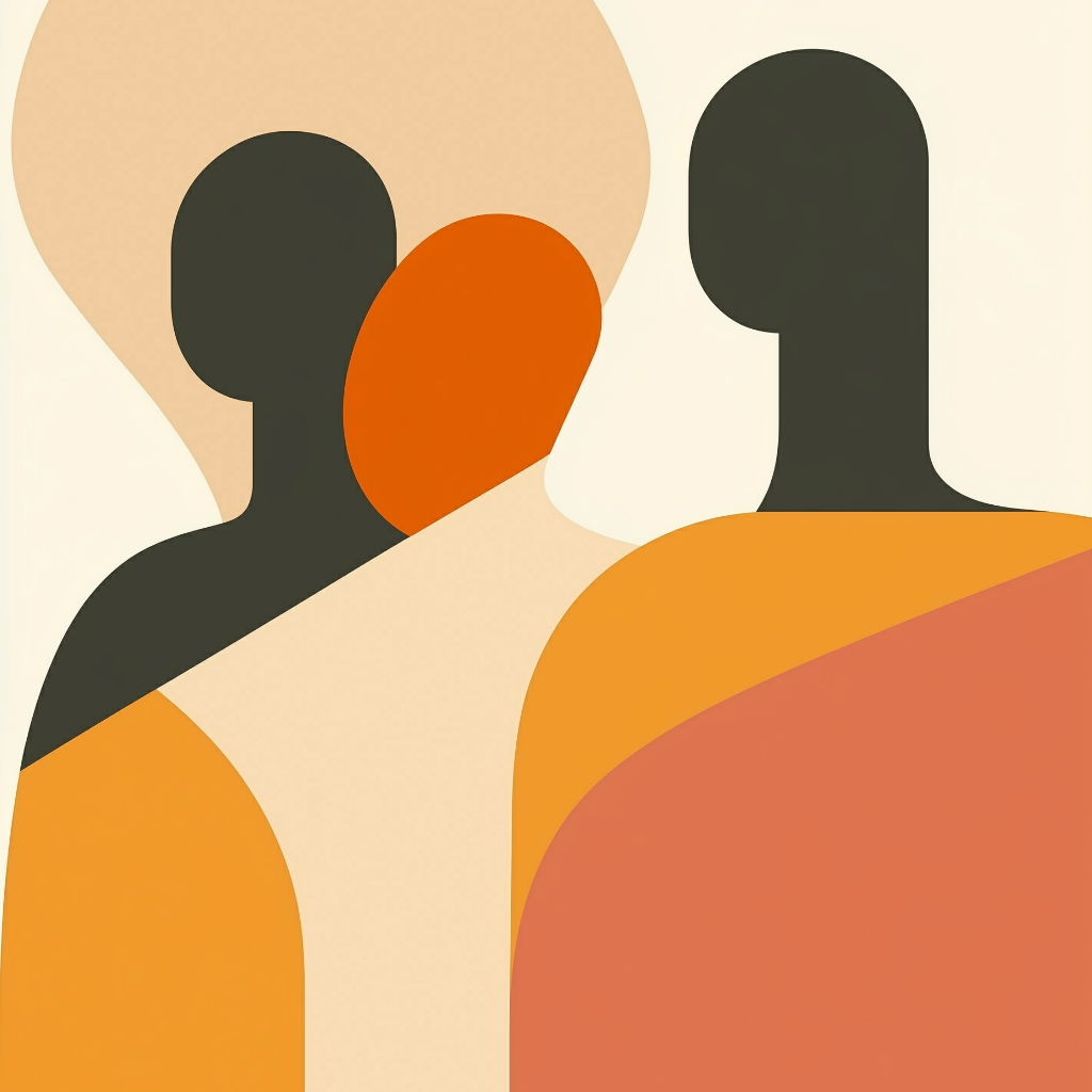 This high-resolution AI artwork captures an abstract group of figures in warm, earthy tones of ochre, terracotta, and cream. Minimalist forms weave together in soft harmony, symbolizing trust, unspoken connection, and silent understanding.