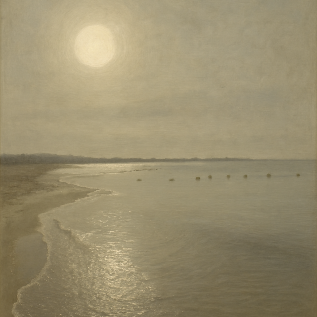 An oil painting in the spirit of Johannes Vermeer captures the Tunisian shoreline in the early hours of the day. The gentle morning sun softly illuminates the calm sea and sandy beach. With a delicate palette of muted warm tones and carefully diffused shadows, the scene evokes a sense of stillness, purity, and contemplative atmosphere. A subtle touch of oriental mystique lingers over the Mediterranean, inviting the viewer to pause and breathe in the quiet light