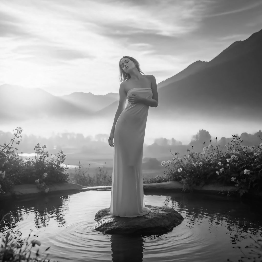 A serene figure stands gracefully on a rock in calm water, surrounded by misty mountains and delicate flora under a soft, ethereal sky.