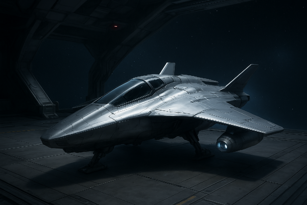 a sleek, futuristic spacecraft stationed inside a dimly lit hangar bay. The setting suggests a space station or interstellar carrier, with metallic walls and a faint glow of ambient blue light illuminating the scene.