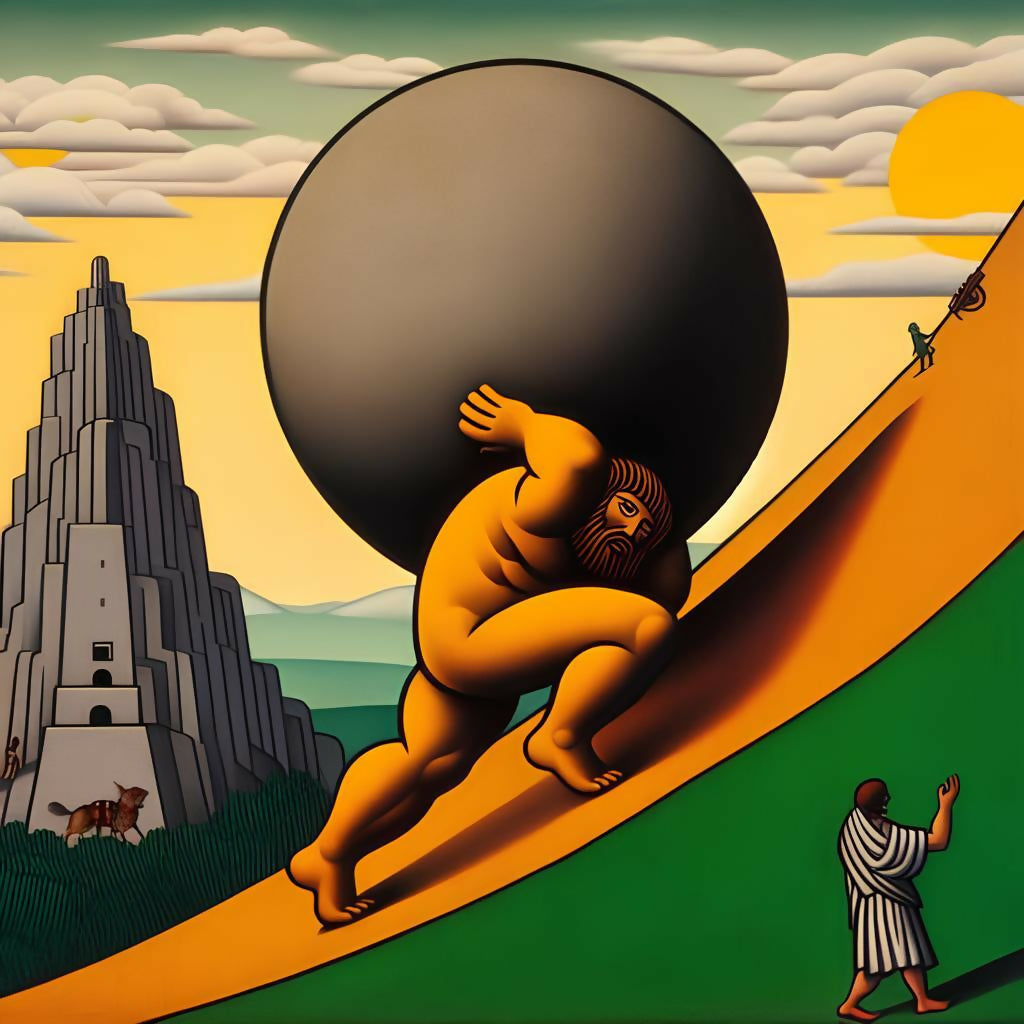 A vibrant AI-generated artwork of Sisyphus pushing a massive boulder uphill, capturing his eternal struggle with dynamic colors, surreal details, and emotional intensity against a mountainous backdrop.