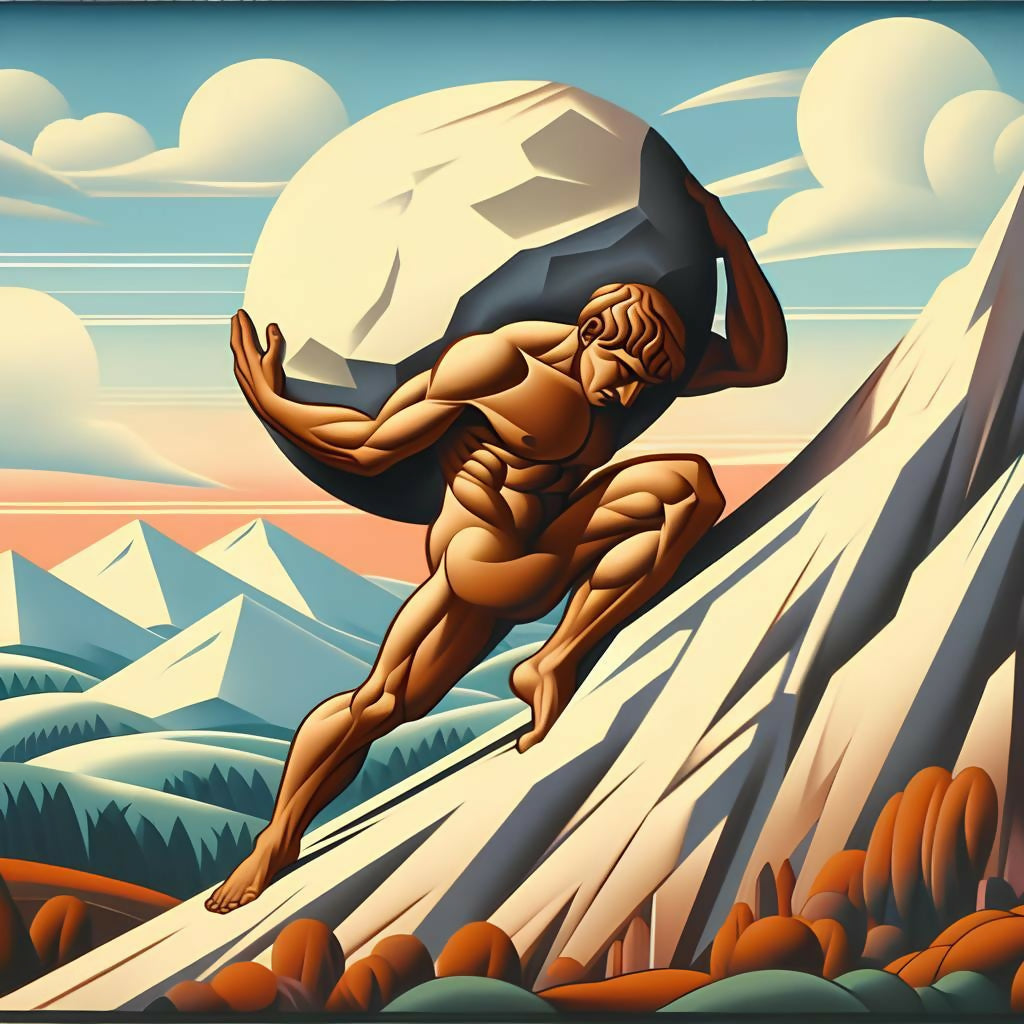 Endlessly pushing a boulder uphill, Sisyphus embodies the eternal struggle against fate. This stunning artwork captures the myth’s raw emotion, resilience, and torment, blending classical symbolism with dramatic visuals to reflect the weight of human perseverance.