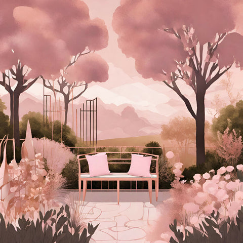 Sit With Me is a stunning AI art that shows the beauty of a park with a touch of rosegold and pink tones.