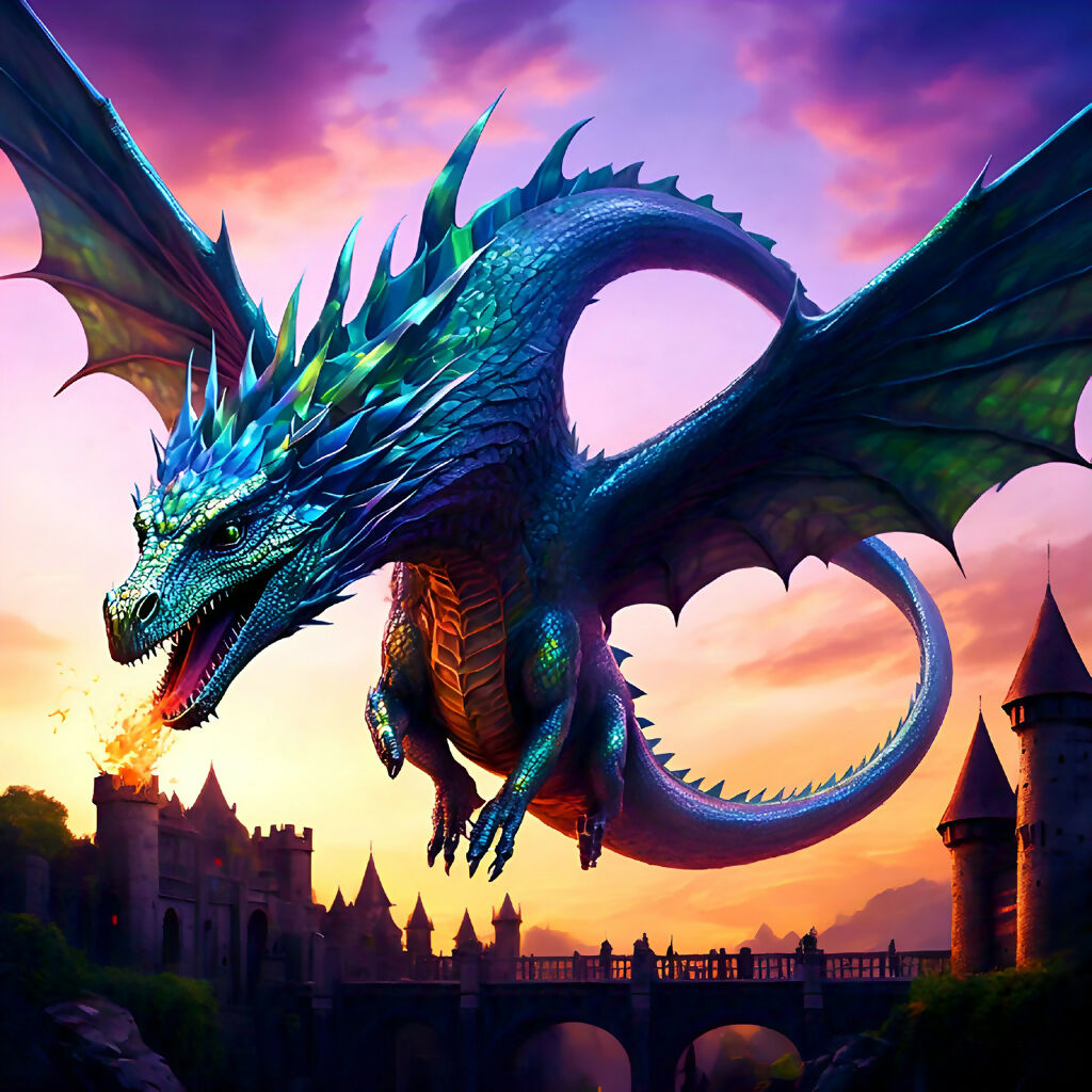 Witness the awe of twilight as a legendary dragon claims the skies above Duskspire Castle. This AI-generated artwork captures a breathtaking moment in a mythical realm where ancient fortresses meet celestial beasts. The dragon, adorned in iridescent blue-green scales and sweeping violet wings, symbolizes power, freedom, and forgotten lore. As the sun dips below the horizon, casting warm hues across the sky, the castle stands resilient—its towers silhouetted against the fiery dusk. Perfect for fantasy lovers, gamers, and collectors, this piece evokes the timeless clash between nature and legend, sky and stone.