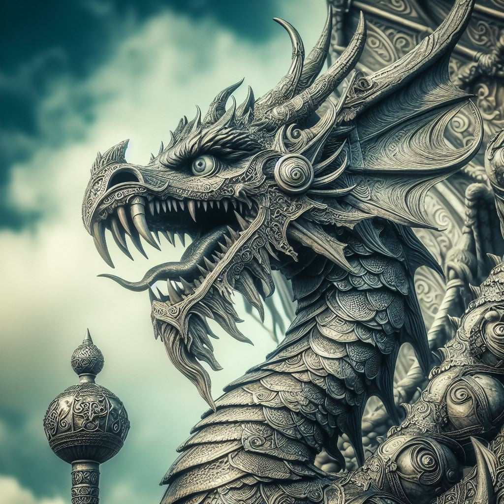 Tags: dragon sculpture, ornate dragon, mythical beast, fantasy guardian, ceremonial staff, cloudy sky, ancient protector, fierce eyes, tribal carvings, surreal realism.