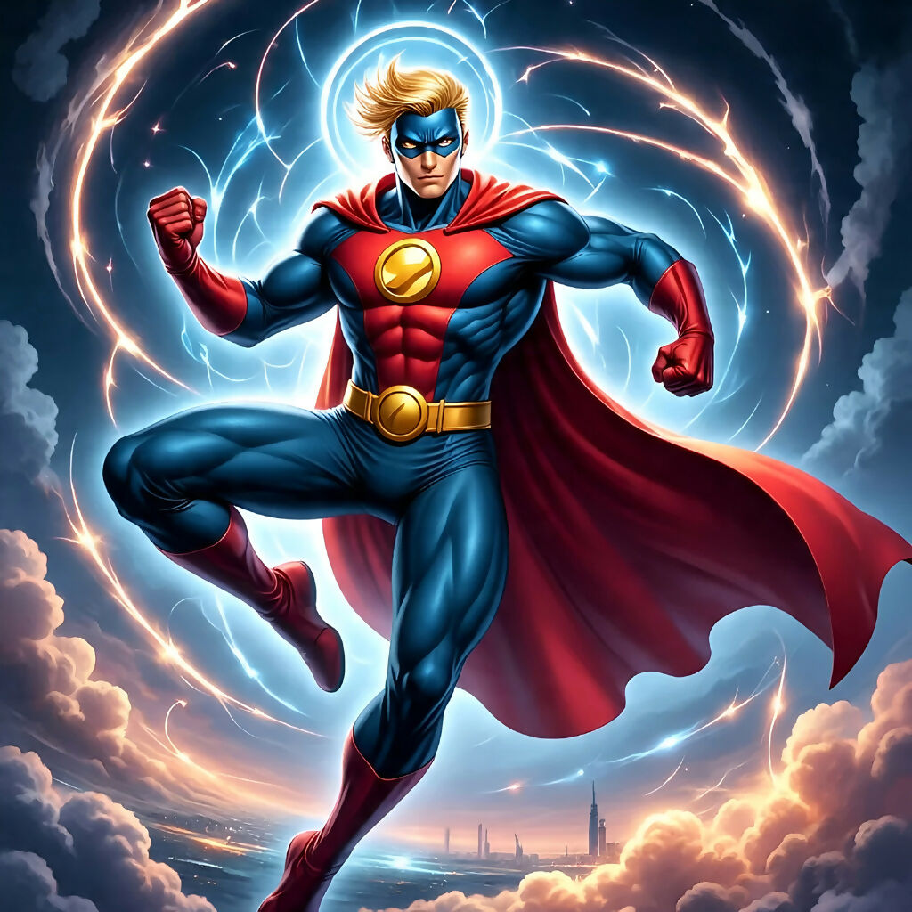 Unleash the energy of a cosmic protector with Skybound Hero Power Surge Pop Art. This AI-generated masterpiece captures a fearless superhero mid-flight, soaring above a futuristic cityscape with a fist raised in defiance and justice. Clad in a radiant blue and red suit with a golden emblem, the character channels the spirit of classic comic book legends while embracing a modern digital twist.
