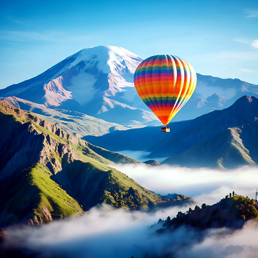 Escape into the tranquil majesty of Skybound Serenity, a breathtaking AI-generated landscape artwork that captures the spirit of adventure and peace. A radiant hot air balloon, painted in vivid rainbow hues, floats gracefully above a mist-filled valley, framed by rugged hills and a towering snow-capped volcanic peak. This piece evokes the quiet thrill of exploration and the serenity of untouched nature. Inspired by dreams of flight and the timeless allure of mountain vistas, this artwork invites viewers to rise above the ordinary and embrace the extraordinary.