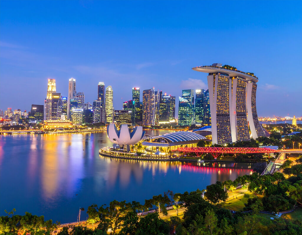 This stunning image captures the vibrant night skyline of Singapore, centered around the iconic Marina Bay Sands. The shimmering lights of the skyscrapers reflect beautifully in the calm waters of Marina Bay, while the uniquely designed ArtScience Museum and the colorful Helix Bridge add architectural charm. The city glows with modern elegance, showcasing Singapore as a perfect blend of innovation, beauty, and urban sophistication.