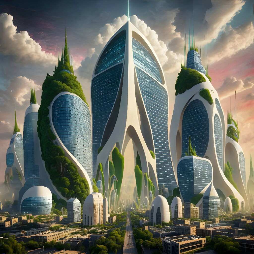 Skyward City is a vibrant digital artwork depicting a futuristic cityscape reaching for the clouds. Lush green spaces weave between towering skyscrapers, creating a harmonious balance between nature and technology. This captivating scene sparks the imagination, inviting viewers to dream about a future where megacities coexist peacefully with the environment.