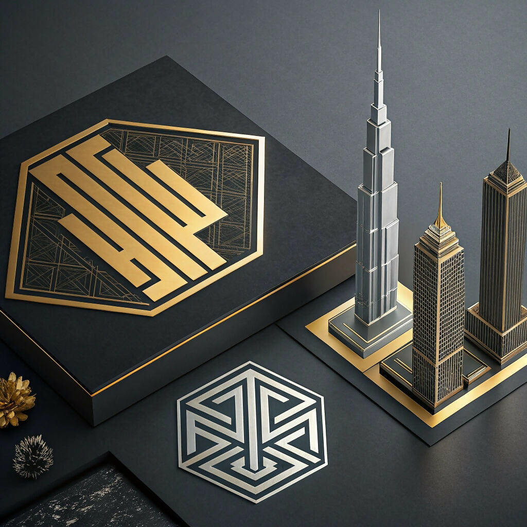 Embedded in the composition are smaller, stylized 3D models of skyscrapers, including one that resembles the Burj Khalifa and another evocative of a New York-style skyscraper. These miniature models are light gray/silver and rest on small, raised platforms.