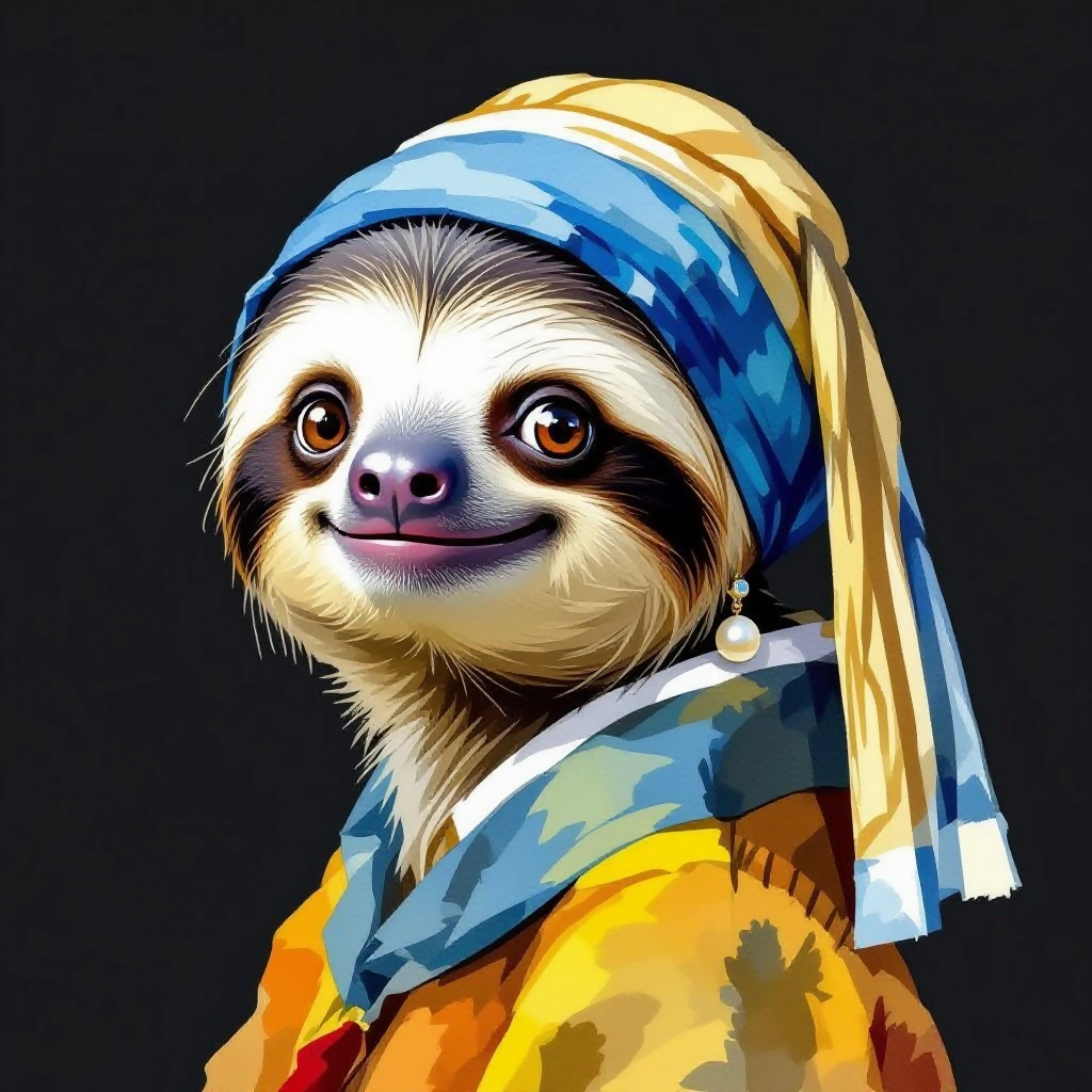 A whimsical reinterpretation of the classic "Girl with a Pearl Earring" painting, featuring a sloth with a joyful expression. The sloth wears a yellow and blue headscarf and a pearl earring, set against a dark background, blending humor with artistic homage.