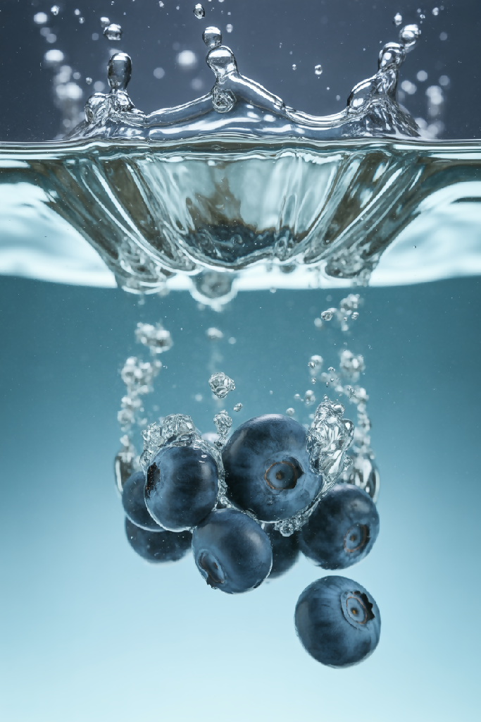 Slow motion cinematic shot of blueberries falling into clear water with splashes, ultra realistic, 4K, vertical video, aspect ratio 9:16